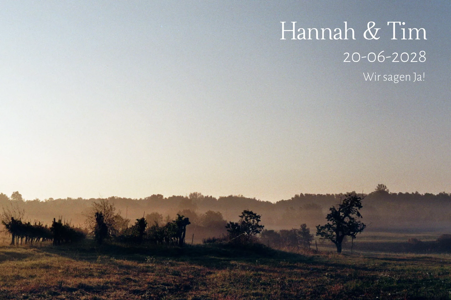 Einfache Einladungskarte zur Hochzeit mit Analogfotografie im Hintergrund. Das Landschaftsbild auf der Postkarte im Querformat eignet sich sehr gut für eine Sommerhochzeit. Auf der Rückseite der Karte ist Platz für Euren Einladungstext.