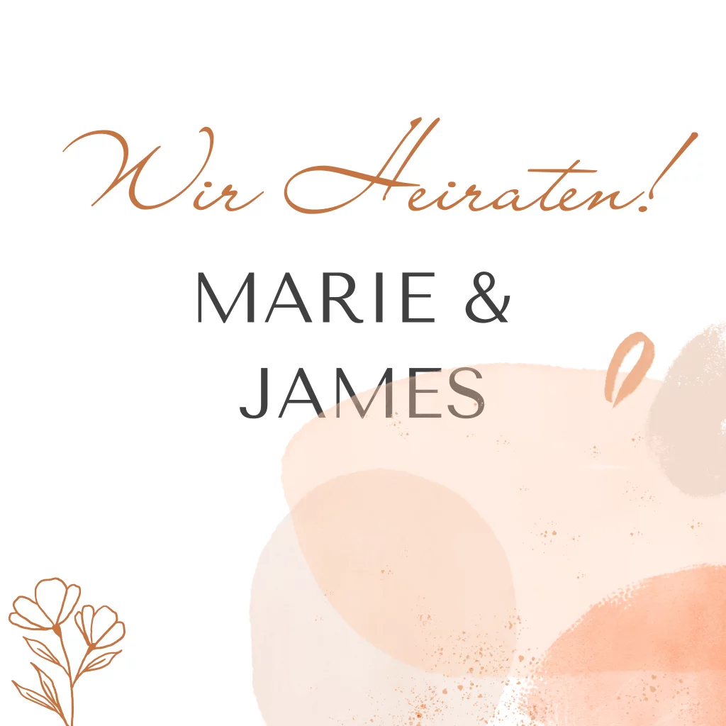 Schlichte quadratische Klappkarte als Einladung zur Hochzeit. Die weiße Karte mit Aquarellelementen und Blüte wurde in Rosa- und Kupferfarben gestaltet.