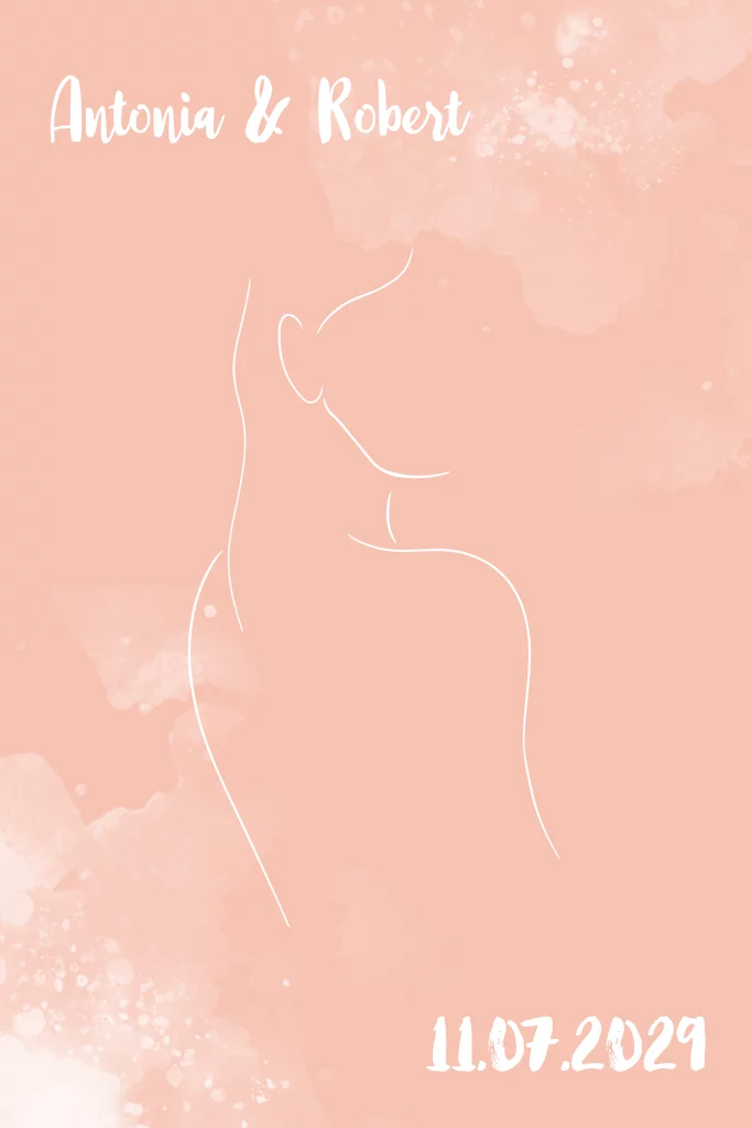 Schlichte Einladungskarte zur Hochzeit in rosa mit Aquarell. Die Karte im Hochformat mit Line Art Frau in weiß bietet auf der Rückseite Platz für Euren Einladungstext.