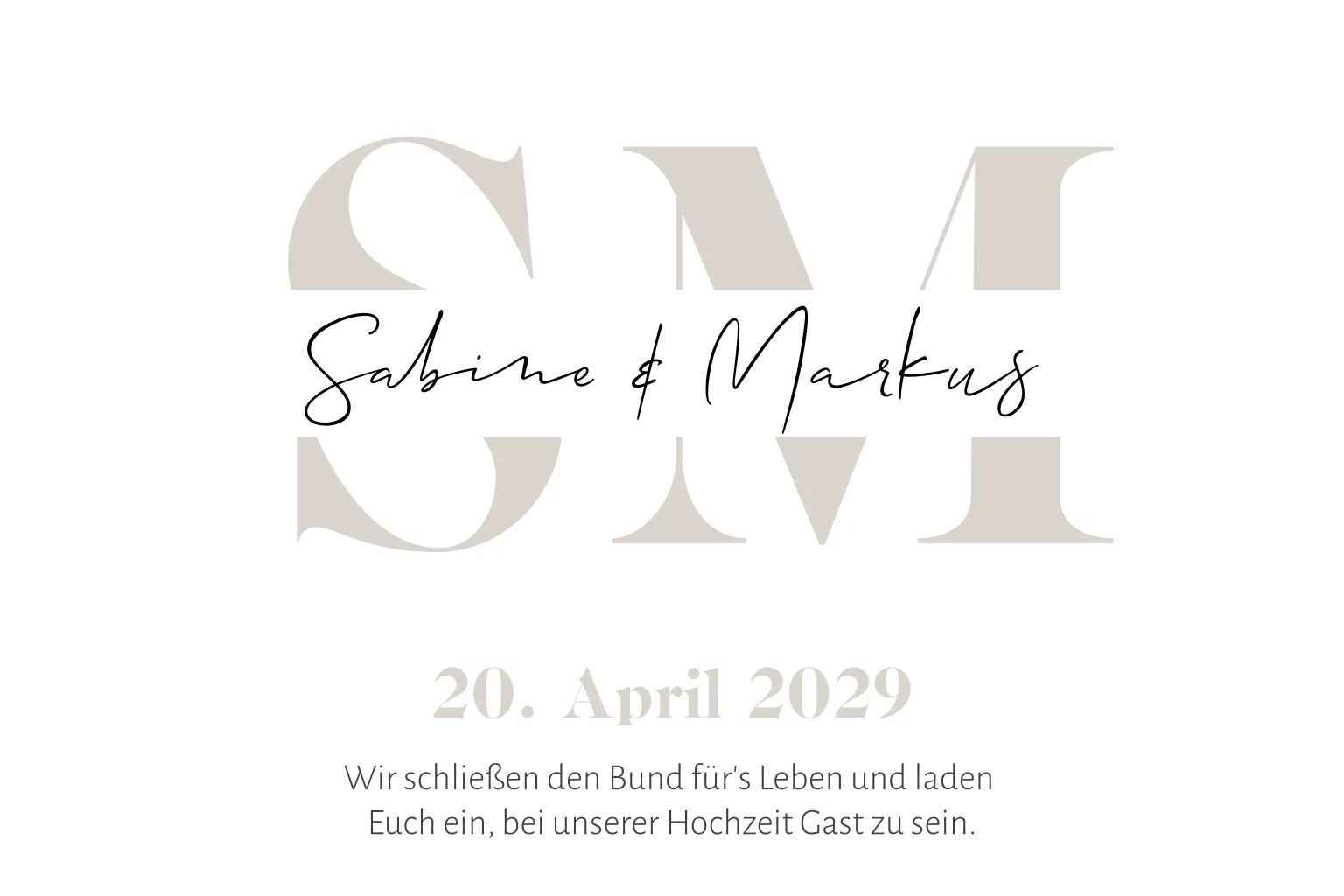 Schlichte Einladung zur Hochzeit mit Initialen in beige. Die moderne Postkarte in weiß hat auf der Rückseite die Anfangsbuchstaben zart in den Hintergrund gestellt.