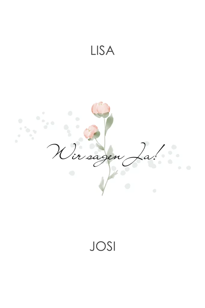 Weiße Einladungskarte zur Hochzeit mit Rose und grünen Sprenkel. Die schlichte Karte im Hochformat hat auf der Rückseite Platz für Euer Verlobungsfoto.