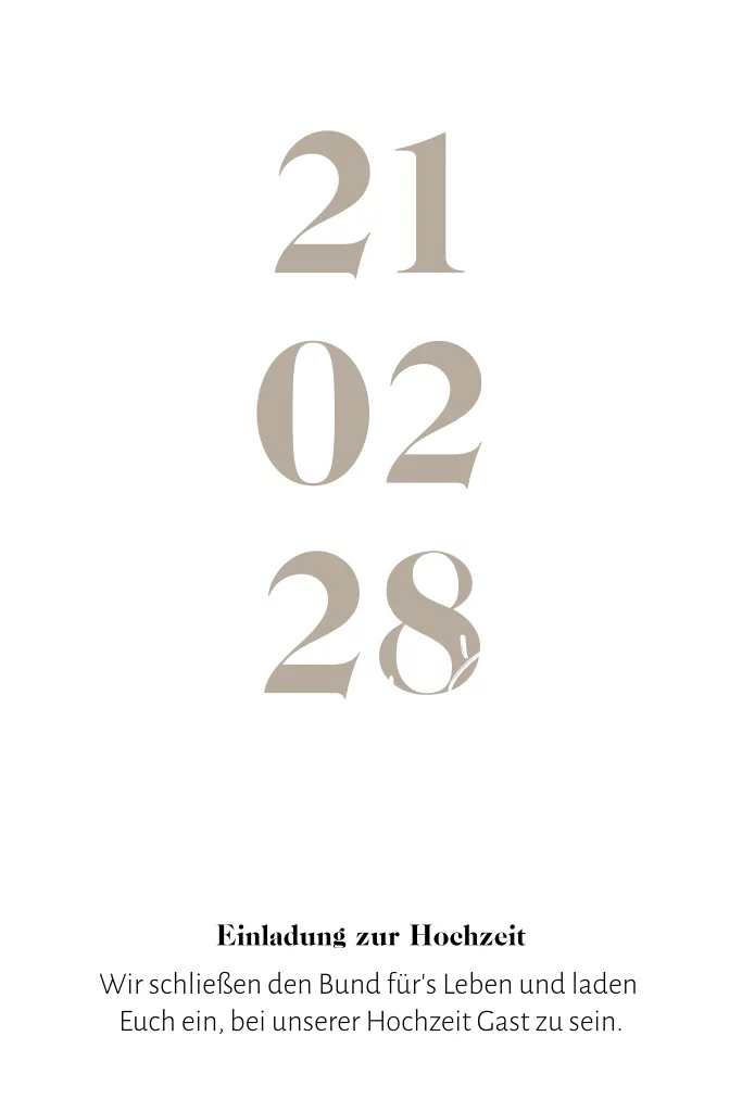 Schlichte Einladungskarte zur Hochzeit mit abgerundeten Ecken. Die Postkarte im Hochformat hat auf der Vorderseite Zahlen in beige. Auf der Rückseite sind diese zart in den Hintergrund gestellt.