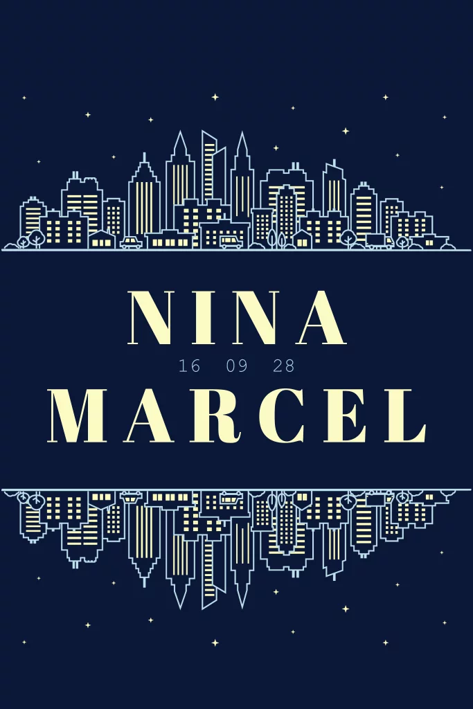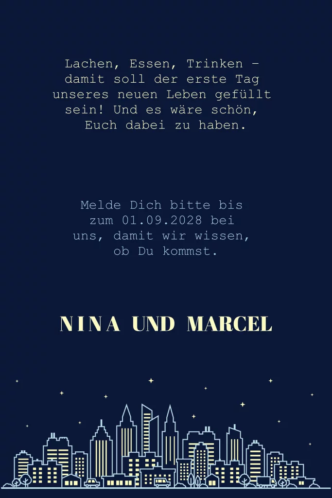 Einladung zur Hochzeit in blau mit Neon Skyline, Sternen und Herzen