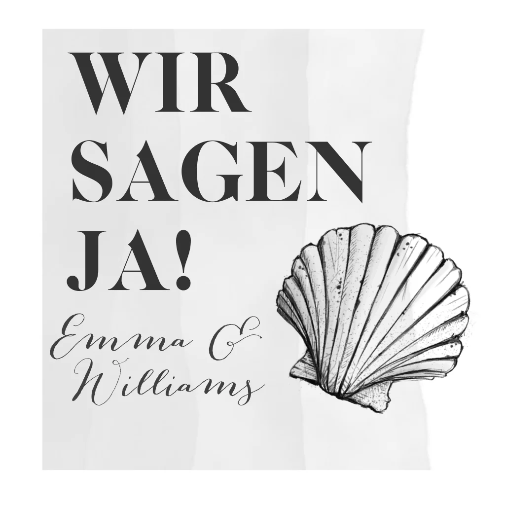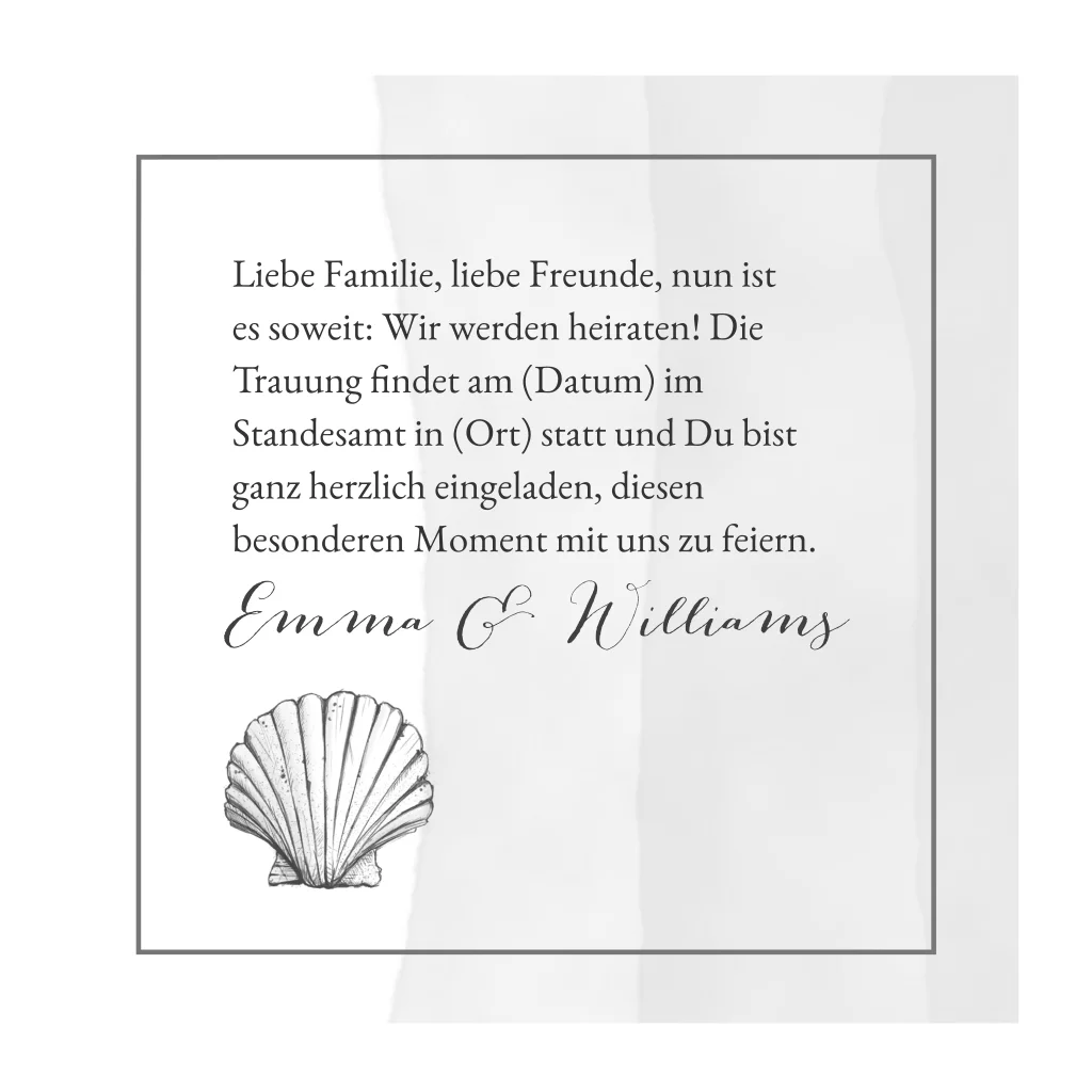 Schlichte Einladung zur Hochzeit in weiß. Die quadratische Klappkarte mit Muschel und Strand in Grautönen bietet ausreichend Platz für Text und Fotos.