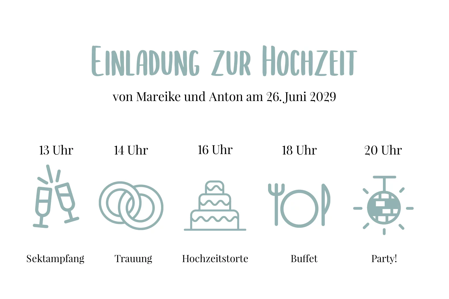 Einladung zur Hochzeit mit Timeline aus blauen Icons. Die Postkarte im modernen Stil gibt Euren Hochzeitsgästen einen zeitlichen Überblick der Hochzeitsfeier.