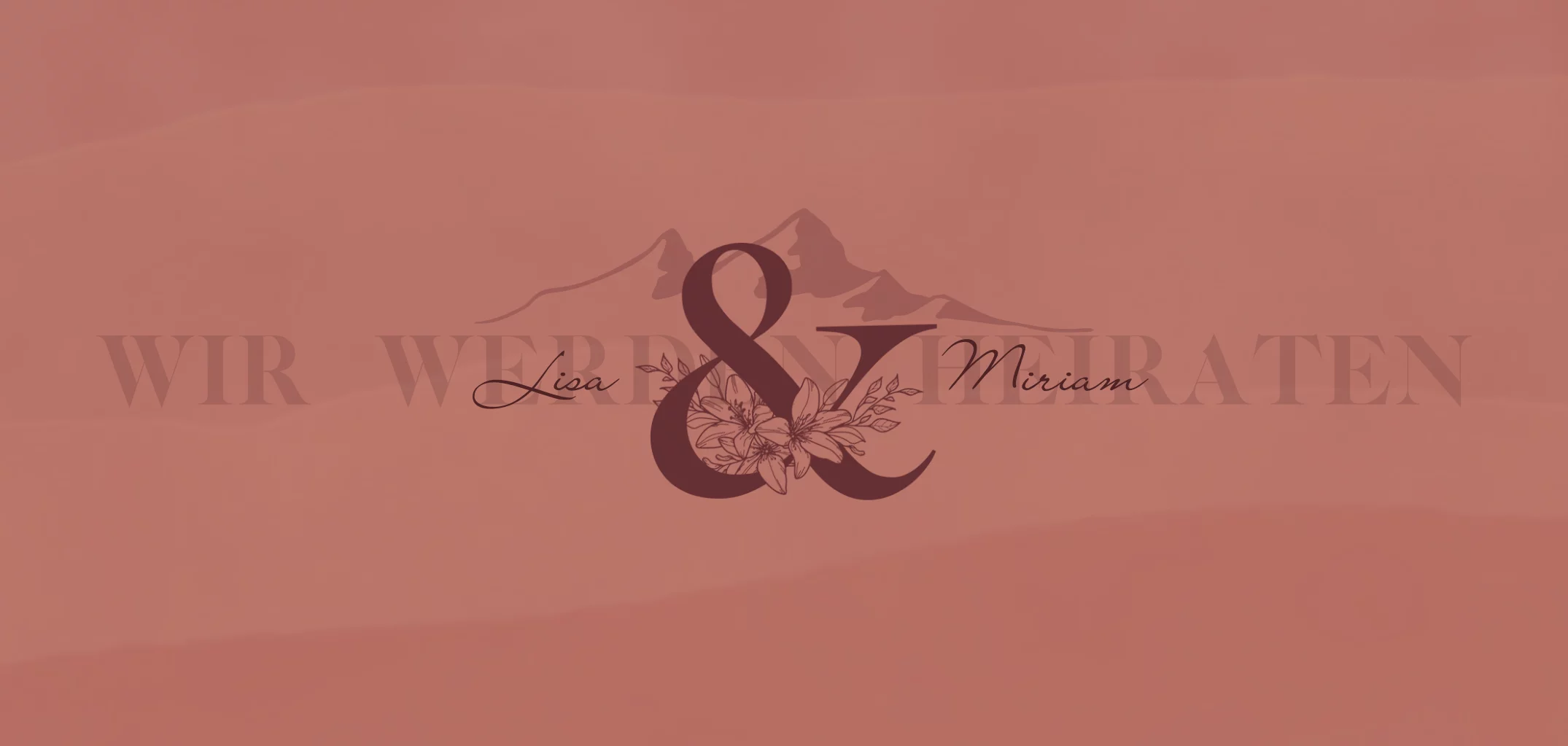 Einladungskarte zur Hochzeit in rot mit Bergen und &-Zeichen. Die Panoramakarte hat auf der Rückseite einen zarten Rahmen und Line Art Blumen.