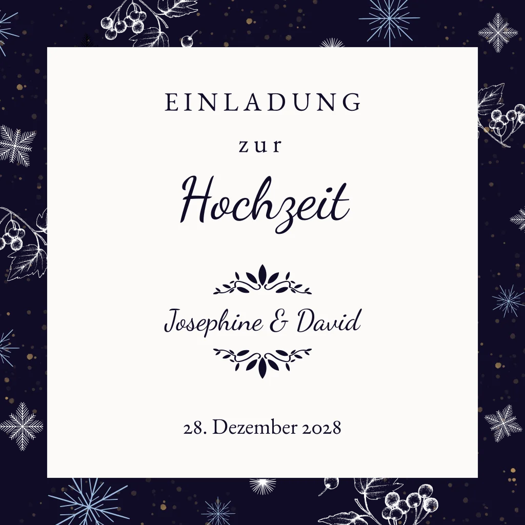Dunkle Einladung zur Hochzeit mit Silberfolie. Die quadratische Karte mit zarten Schneeflocken und Ornamenten ist eine tolle Einladung zu einer Winterhochzeit.