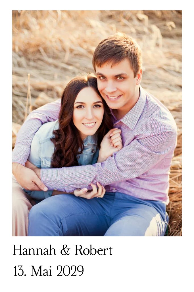 Weiße Hochzeitseinladung mit Foto und Symbol für Mann und Frau. Das Zeichen ist mit Roségold veredelt.