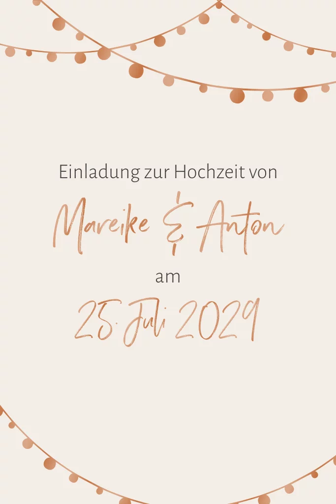 Veredelte Einladungskarte zur Hochzeit in beige. Die Karte im Hochformat ist einer mit Lichterkette in hochglänzendem Kupfer gestaltet und hat abgerundete Ecken.