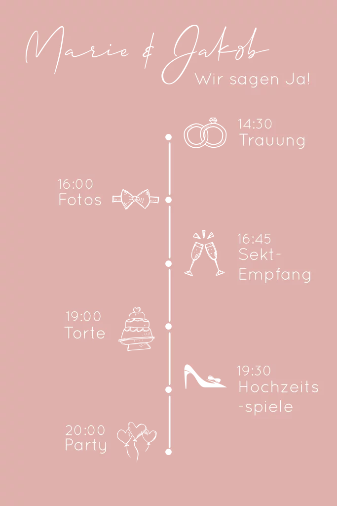 Veredelte Einladungskarte zur Hochzeit mit Timeline und Icons in silber auf der Vorderseite. Die Karte im Hochformat mit abgerundeten Ecken ist in altrosa gestaltet.
