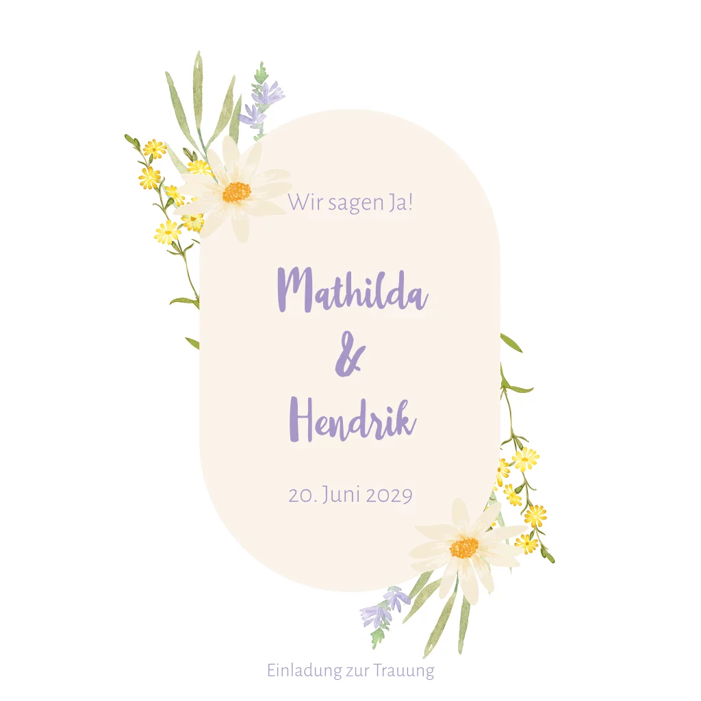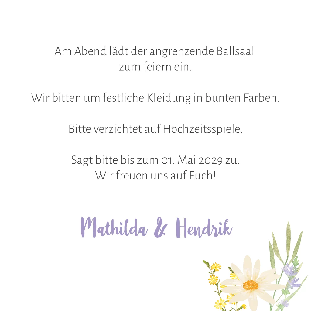 Verspielte Hochzeitseinladung in weiß mit bunten Blumen + lila Akzente