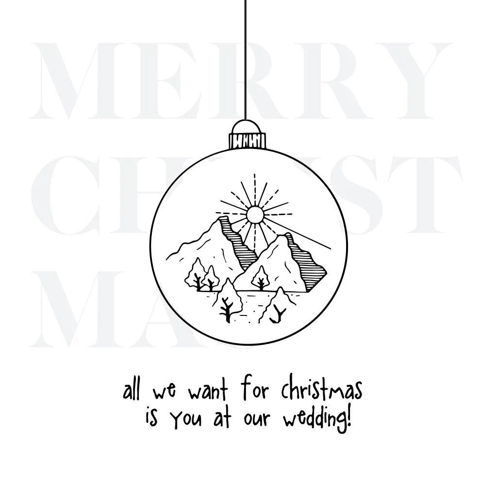 Weiße Einladung zur Hochzeit mit englischem Spruch. Die quadratische Karte hat eine Weihnachtsbaumkugel und Bergpanorama in zart gezeichneten schwarzen Linien auf der Vorderseite. Im Innenteil der Seite ist Platz für Euer Foto und den Einladungstext.