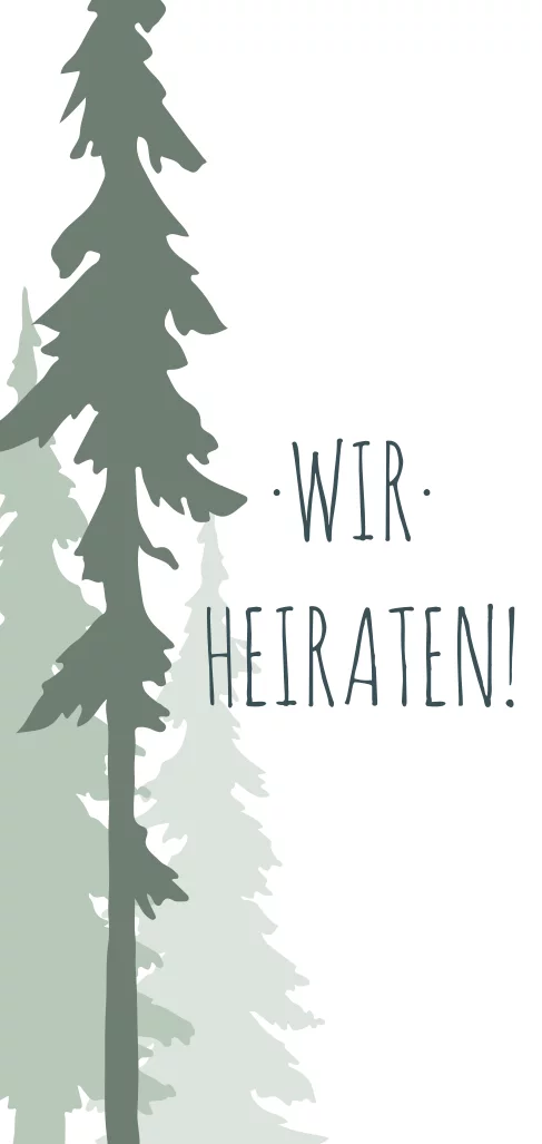Schlichte, weiße Einladung zur Hochzeit im Hochformat als Panoramakarte. Das Tannen Motiv in grün eignet sich sehr schön für eine rustikale Hochzeit.
