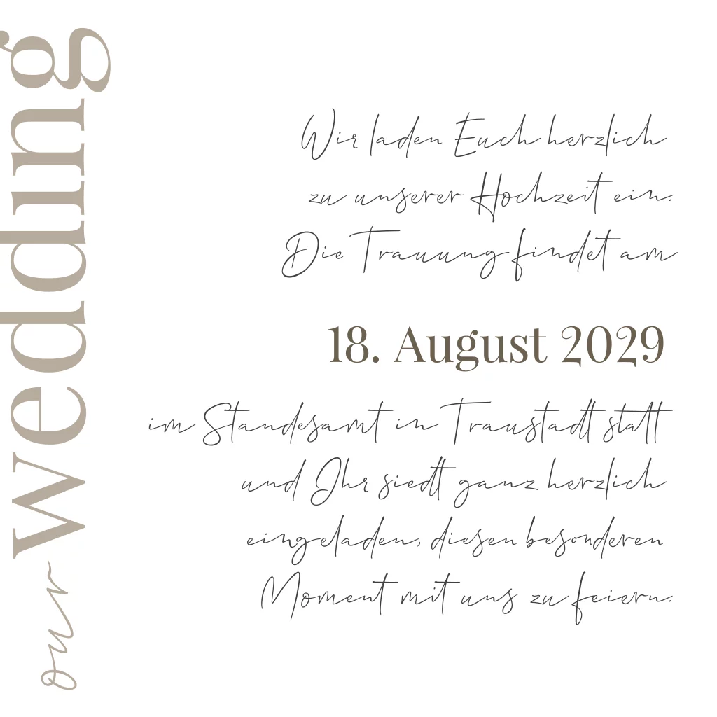 Moderne und wendbare Einladungskarte zur Hochzeit. Die quadratische "our wedding" Karte ist in beige und weiß in modischer und schlichter Gestaltung.
