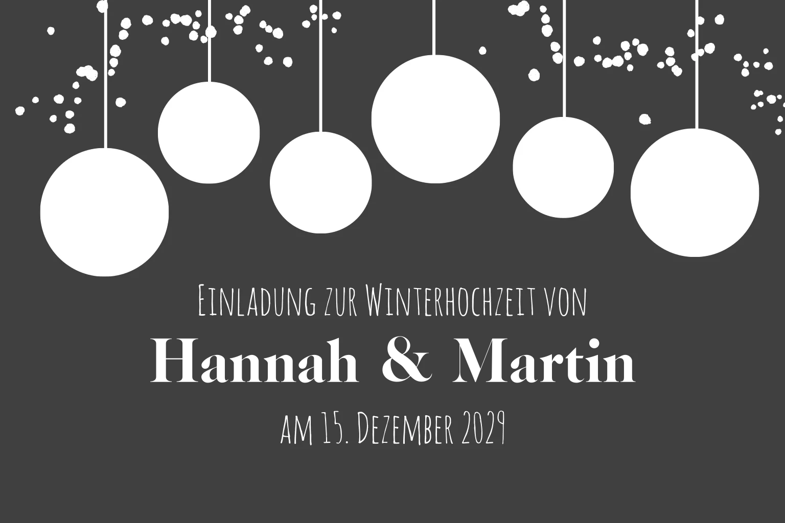 Winterliche Einladungskarte zur Hochzeit in anthrazit mit vergoldeten Symbolen in Christbaumkugeln. Die Postkarte wird mit goldenen Sprenkeln veredelt und bekommt dadurch einen weihnachtlichen Hauch.