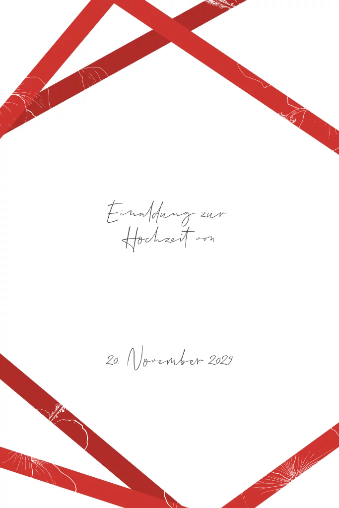 Winterliche Einladungskarte zur Hochzeit mit roten "Bändern" und veredelten Line Art Blüten in gold. Die Karte ist perfekt für alle Paare, die in der Weihnachtszeit heiraten möchten.