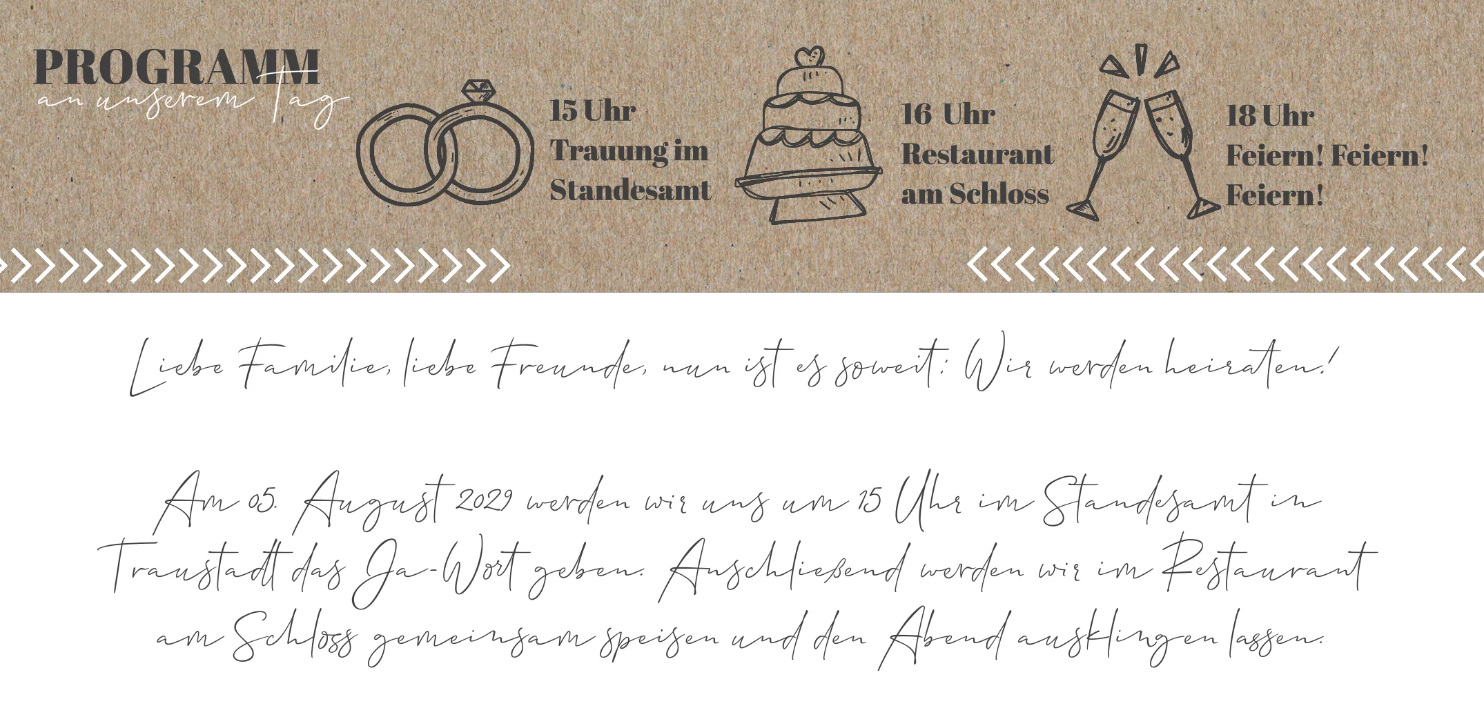 Hochzeitseinladung mal anders: Einseitige Einladungskarte im Panoramaformat mit verspielter Schrift und Symbolen, Wie Torte und Ringe in schwarz. Die Vorderseite mit Programm als Timeline ist zu Teilen weiß, die Rückseite vollständig aus Kraftpapier.