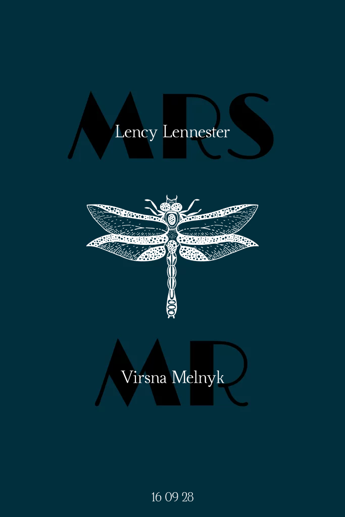 Elegante Einladung zur Hochzeit mit Libelle in Goldfolie veredelt. Die Karte im Hochformat ist in dunkelblau gestaltet und wird von Mrs and Mr geprägt.