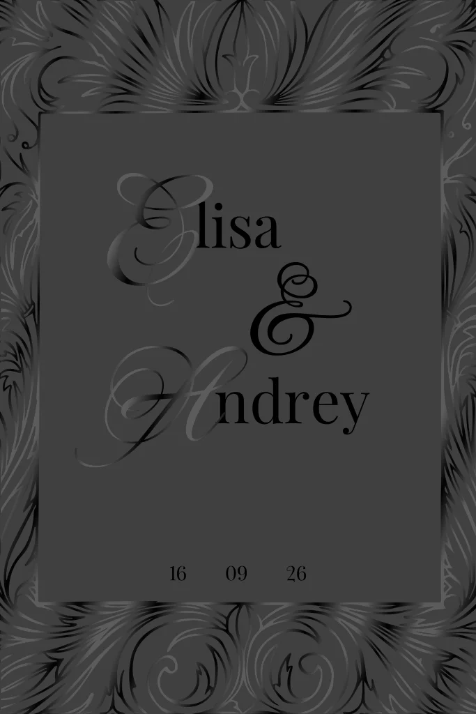 Dunkle elegante Hochzeitskarte mit Ornamenten und Sprenkel in schwarzer Folie und eleganten Musterlinien.