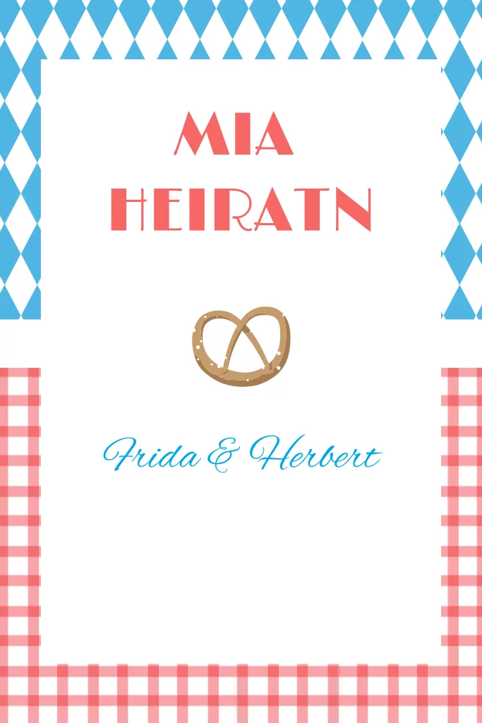 Bayrische Hochzeitseinladung mit Mustern in blau-weiß und rot-weiß plus Brezeln.