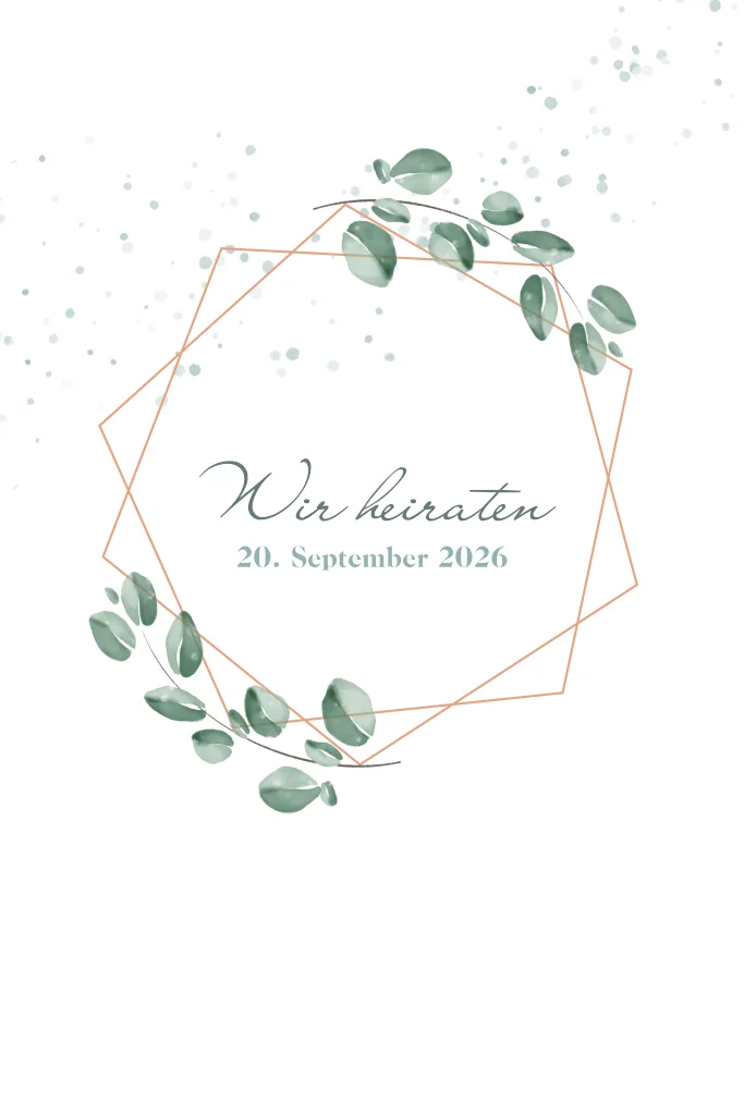 Moderne und strahlende Einladungskarte zur Hochzeit mit grünen Zweigen und Roségold Veredelung als Klappkarte.