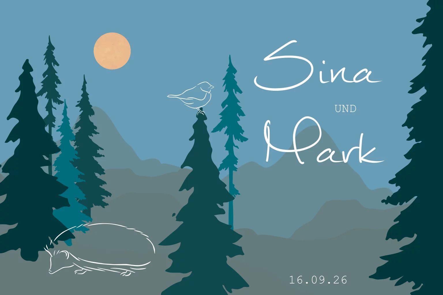 Hochzeitskarte als Klappkarte mit Wald, Tieren und Bergpanorama