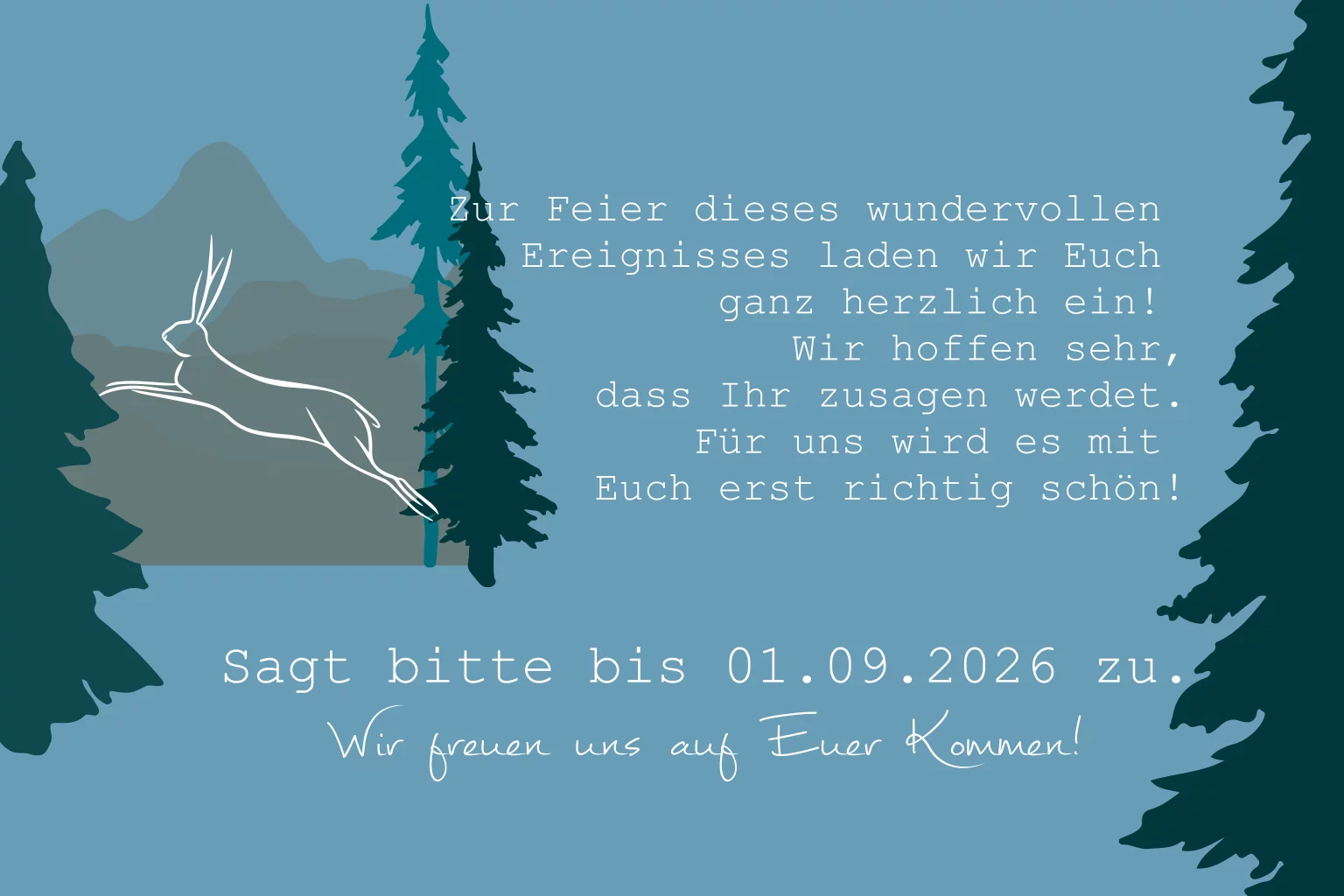 Diese Einladungskarte zur Hochzeit mit verschiedenen Tieren, Tannen und Berge versetzt Euch förmlich in die Natur. Die Klappkarte in blau, grau und grün bietet Platz für Euer Foto und Text auf der Innenseite.