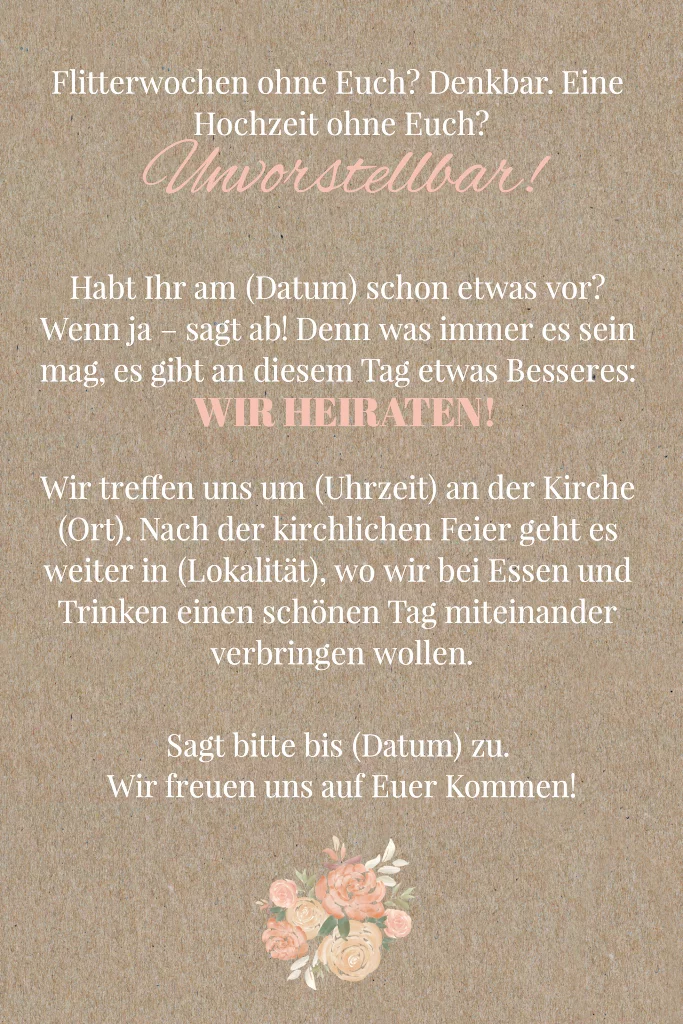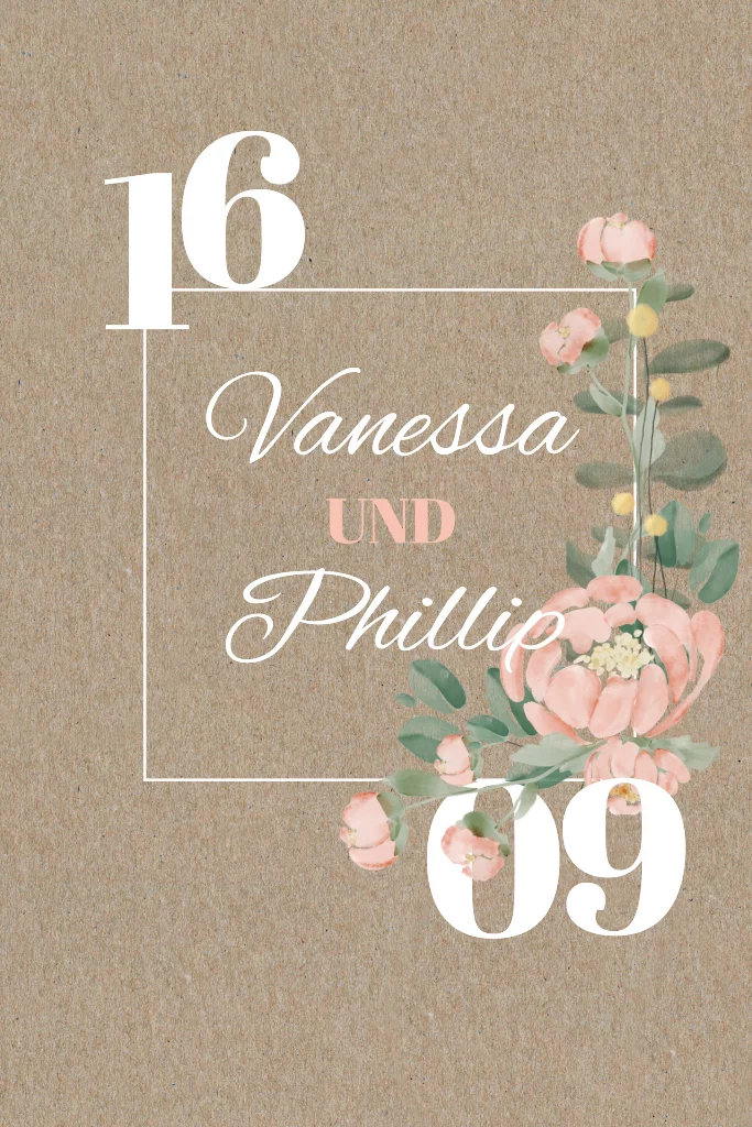 Diese wundervolle Hochzeitseinladung mit romantischen Blumenbouquet und pastelligen Rosé wird Eure Gäste in Vorfreude versetzen. Die Klappkarte im Postkartenhochformat aus echtem Kraftpapier bietet genügend Platz für Text.