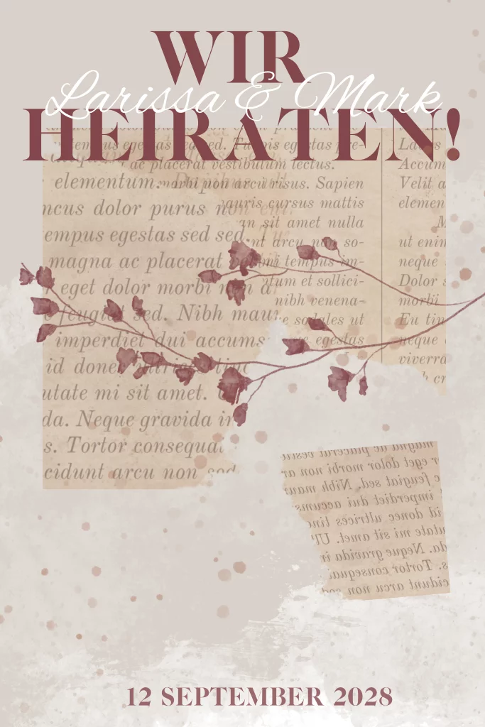 Rustikale Einladung mit Foto, floralem Element und Zeitungsausschnitt
