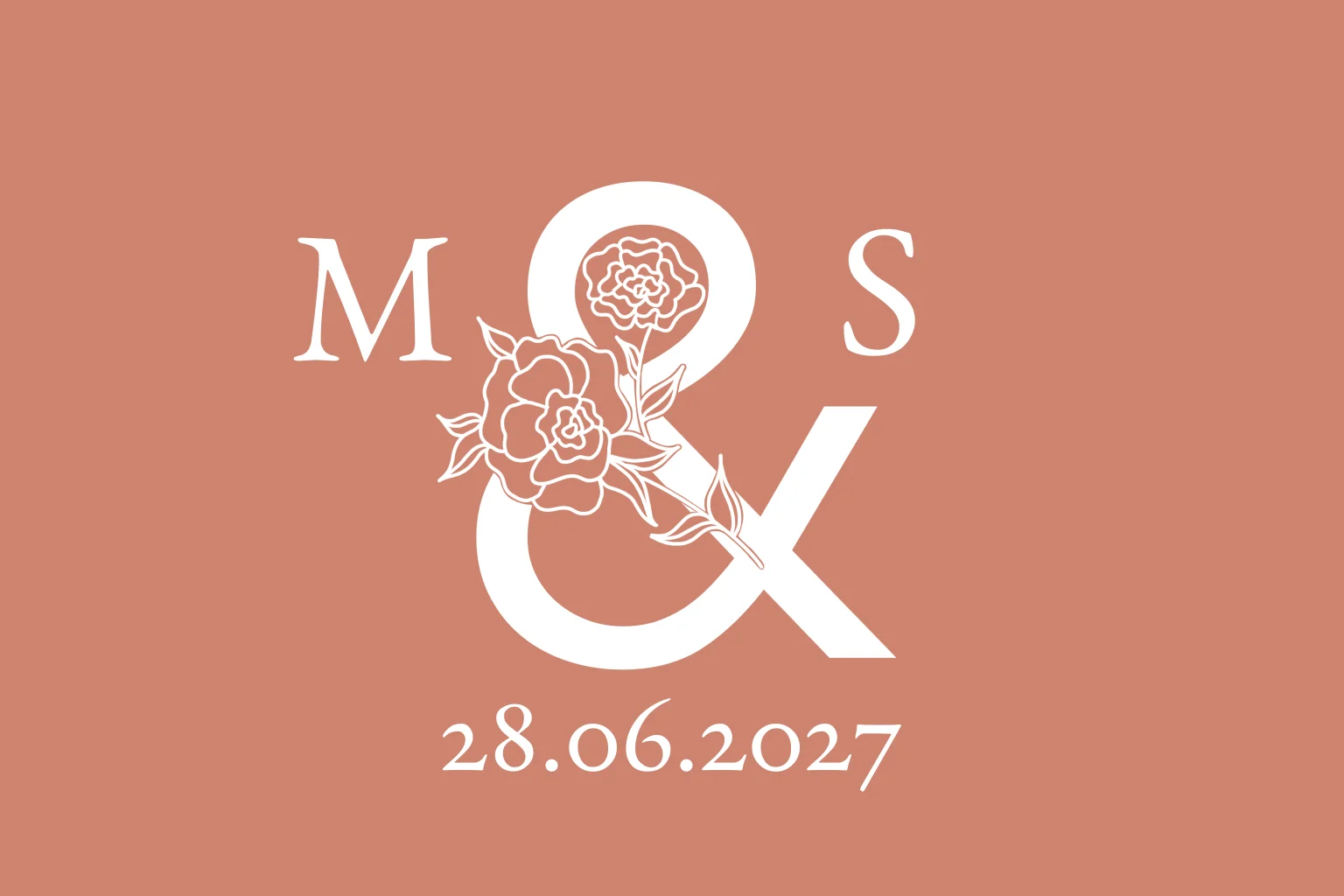 Wunderschöne minimalistische Hochzeitskarte als Postkarte in orange braun mit verschlungener Rose im &-Zeichen.