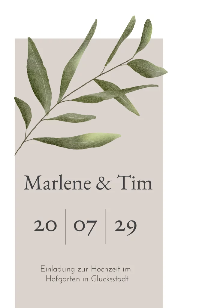 Schlichte, moderne Hochzeitskarte mit Olivenzweig in beige und weiß