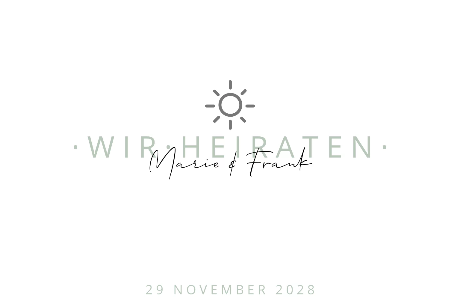 Schlichte Einladungskarte mit grünem Schriftzug, Icons und Timeline.