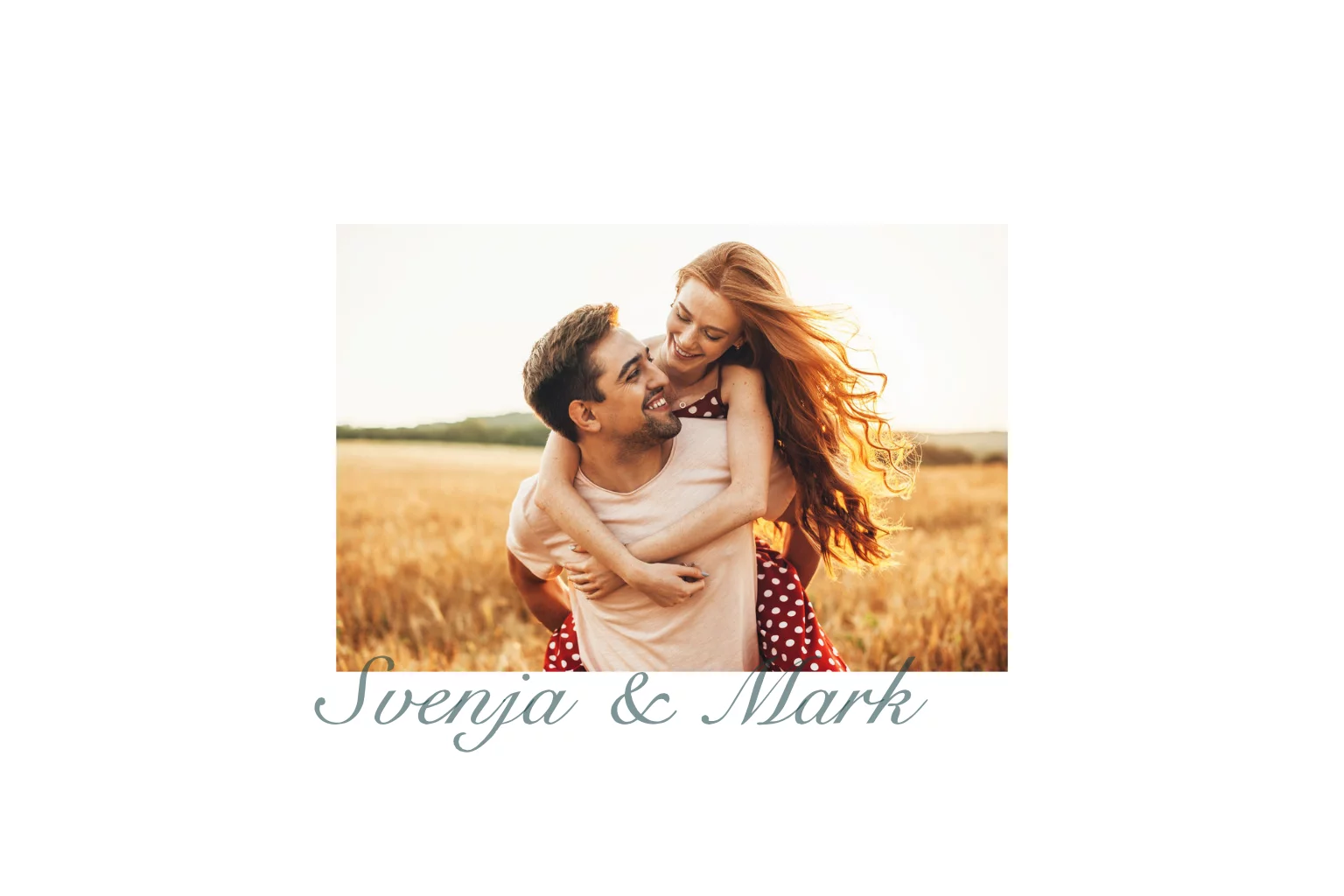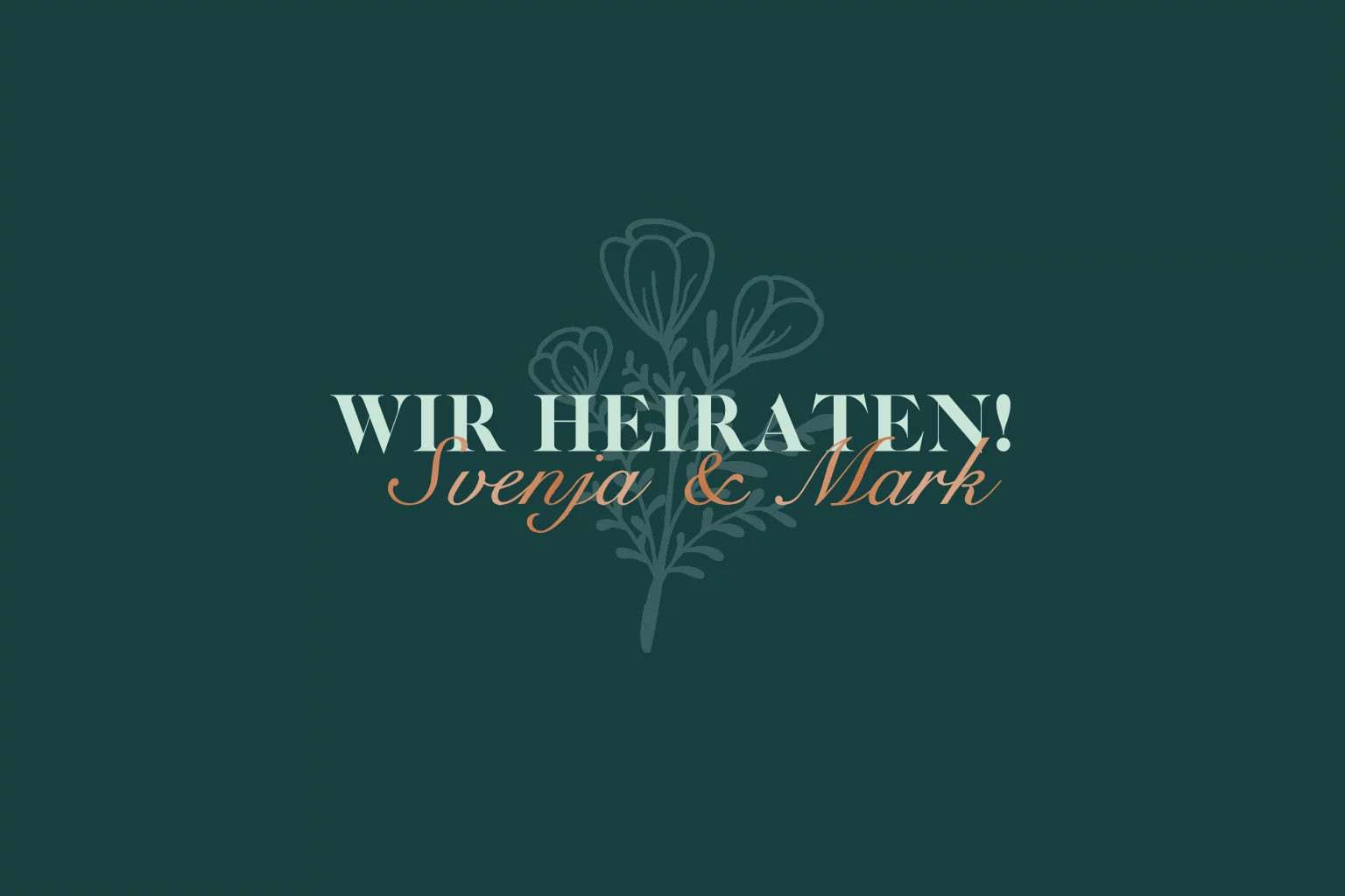 Schlichte Einladungskarte zur Hochzeit in Petrol mit Line Art Blume. Die Klappkarte bietet genügend Platz für Eure Fotos und Text.