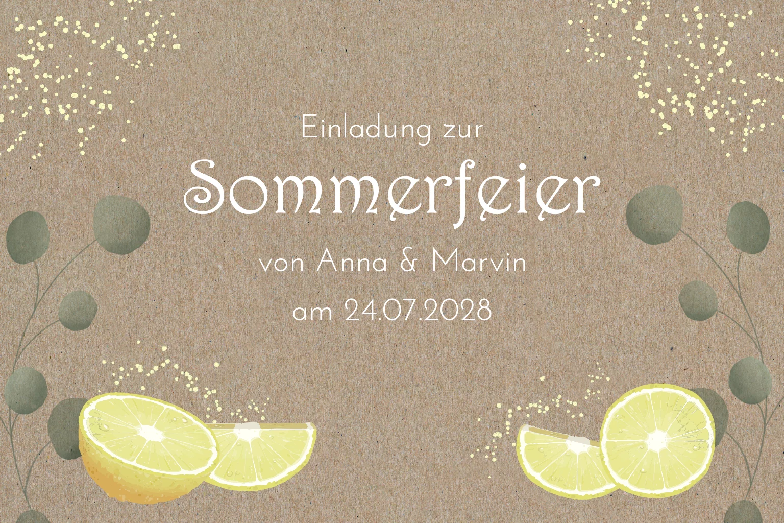 Sommerliche Einladungskarte aus Kraftpapier mit Zitrusfrüchten und Eukalyptus.