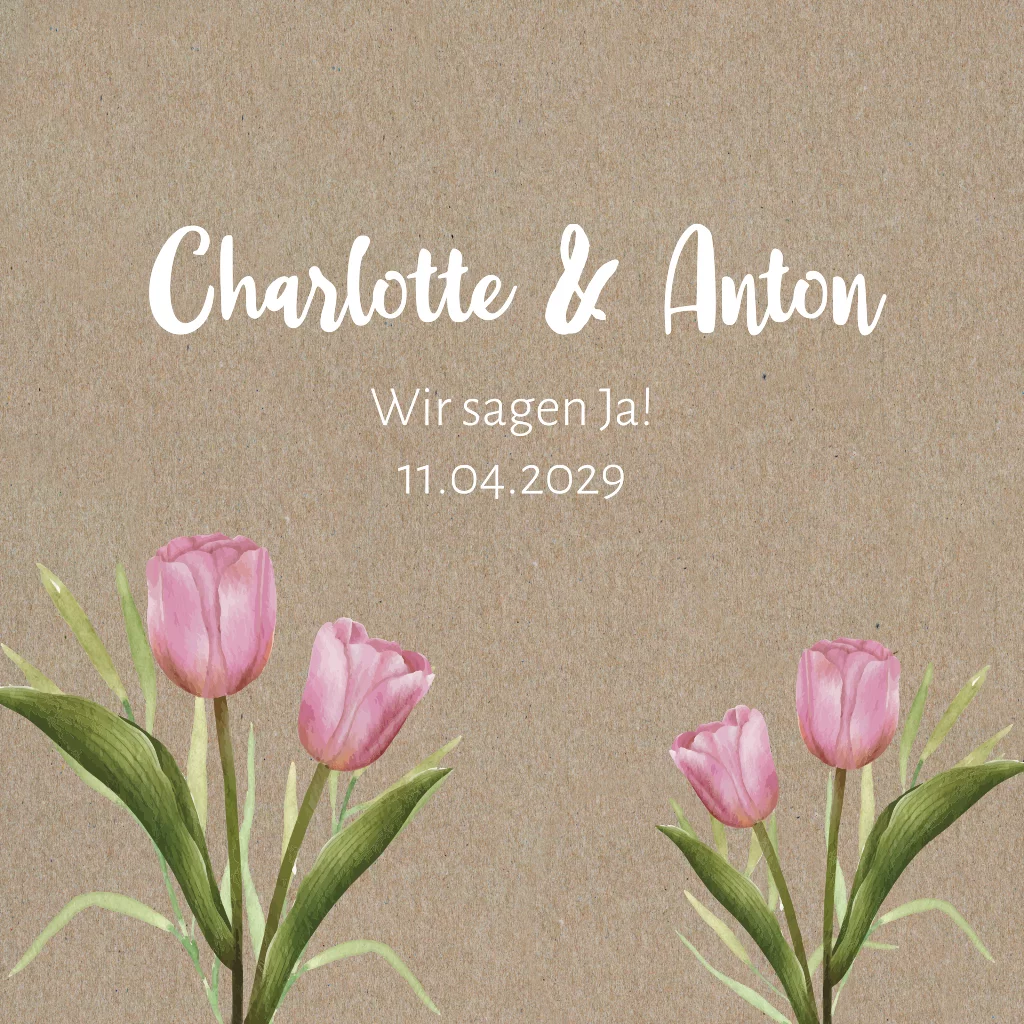 Quadratische Einladungskarte zur standesamtlichen Hochzeit aus Kraftpapier mit rosa Tulpen.