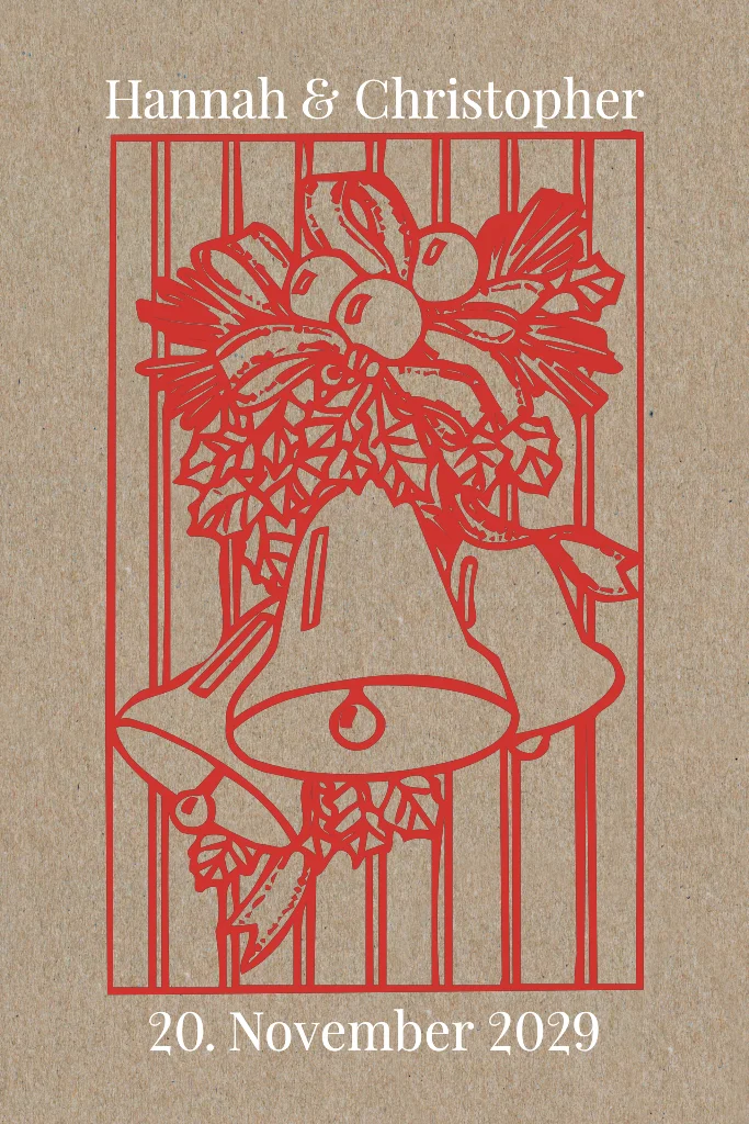 Kraftpapiereinladung ins Standesamt mit roter Glocke und Mistelzweig