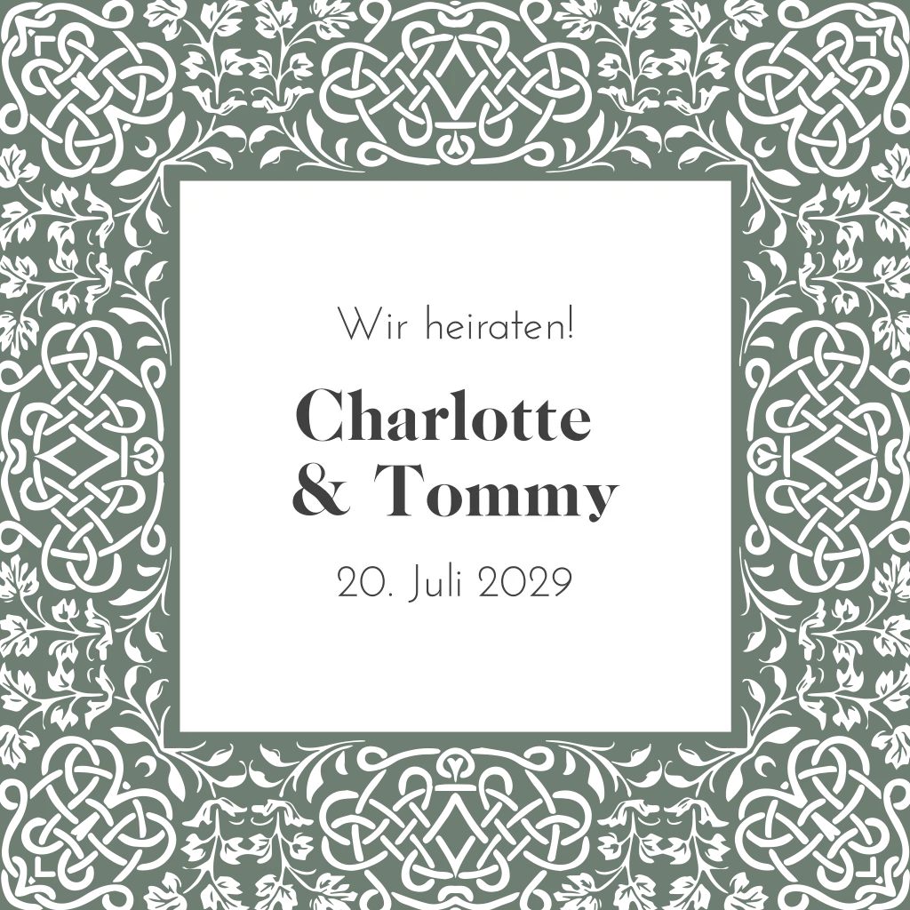 Veredelte Einladungskarte mit Muster in Schwarz. Die quadratische Hochzeitskarte wirkt durch die Folierung besonders edel.