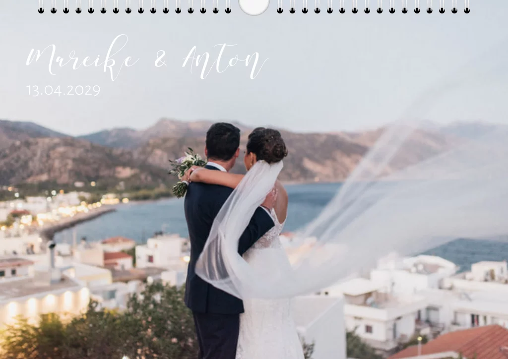Fotokalender mit Spirale als Geschenk zur Hochzeit im Querformat. Der schlichte Fotokalender kann als Hochzeitsgeschenk dem Brautpaar überreicht werden oder dient als Erinnerung nach der Hochzeit. Die Größe des Kalenders ist A4.