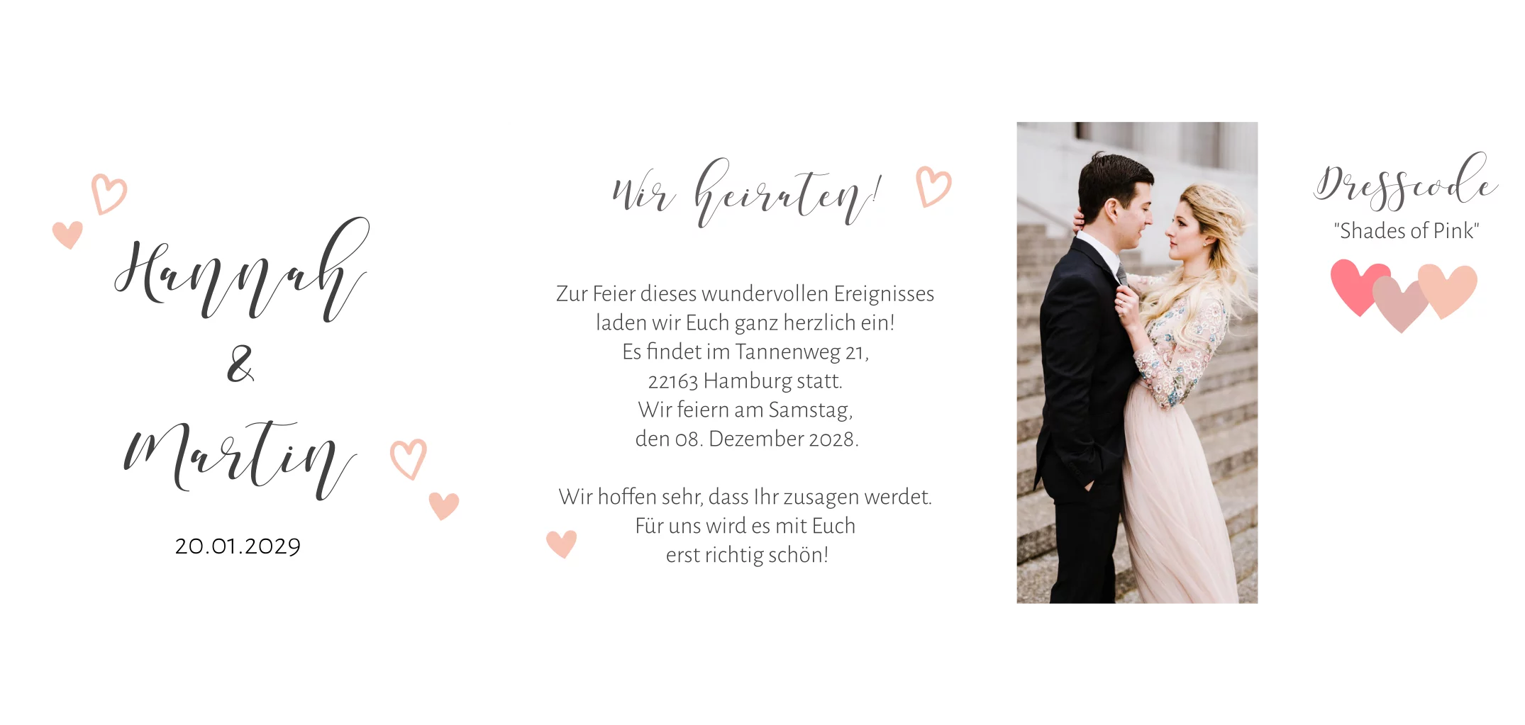 Einladung zur Hochzeit mit Herzchen in rosa und Foto für ein quadratisches Pocketfold. Das weiße Einladungskarten-Set besteht aus 4 Teilen.