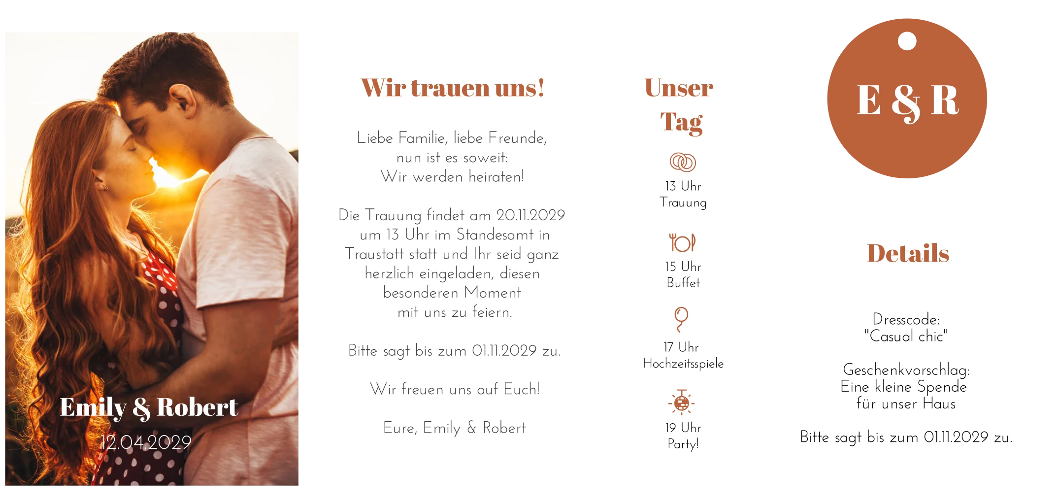 Weißes 5-teiliges Kartenset als Pocketfold Einladung für die Hochzeit mit Foto und Akzenten in orange. Das Set kann in einem Umschlag im Querformat versendet werden.