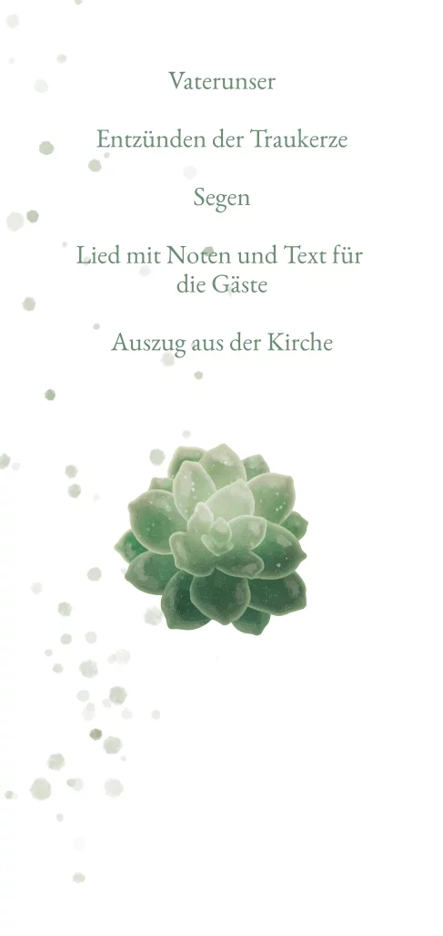 Schlichtes Kirchenheft als Klappkarte mit Sukkulente und grünen Punkten.