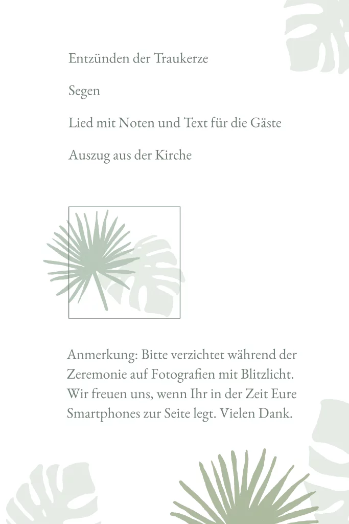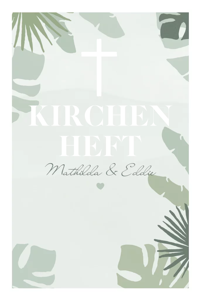 Klappkarte in grün als Kirchenheft mit Dschungel Look. Das Programmheft hat Palmen- und Monsterablätter und kann poliert werden.