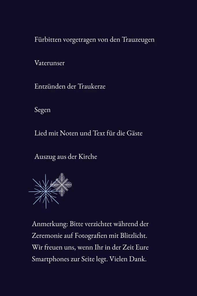 Winterliches Programmheft für die kirchliche Trauung. Die dunkle Klappkarte wird mit zarten Schneeflocken und Winterzweigen aus Silberfolie veredelt.