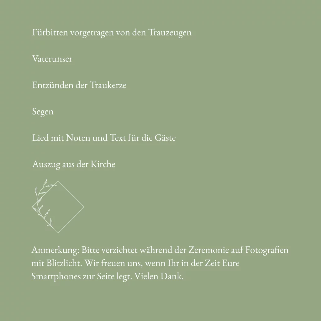 Quadratisches Kirchenprogramm zur Hochzeit mit geometrischem Rahmen. Die weiße Klappkarte wird mit floralen Line Art Elementen geziert und hat im Innenteil eine grüne Seite.