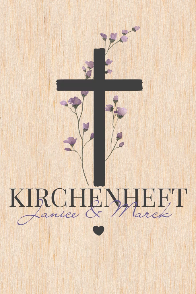 Kirchenheft mal anders: Karte aus Echtholz mit Kreuz und lila Blüten