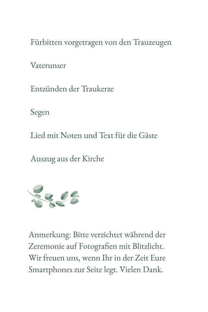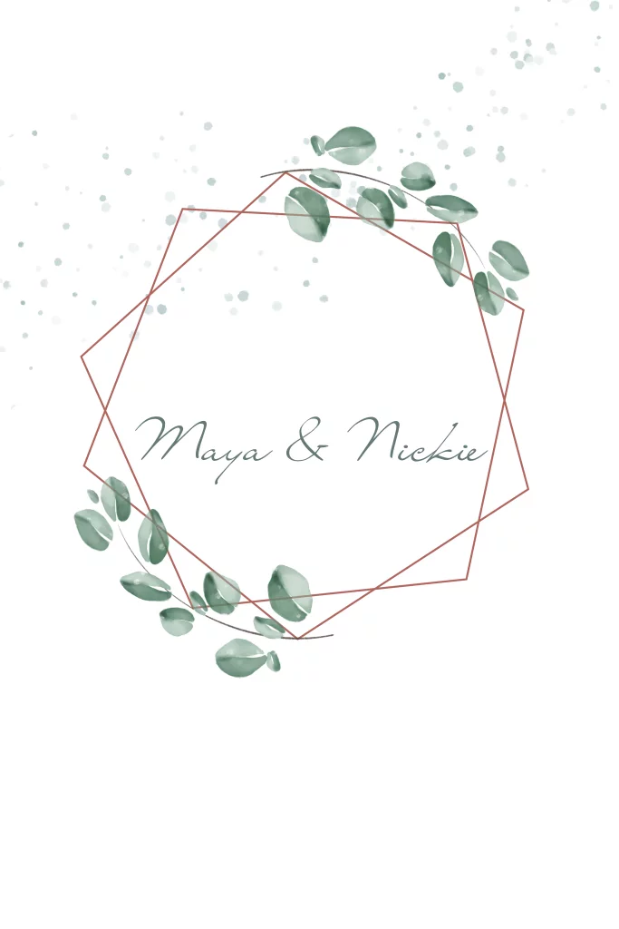 Modernes Programmheft für die Kirche mit geometrischem Rahmen in Roségold und Greenery Zweig. Die Klappkarte wird mit Sprenkeln verziert.