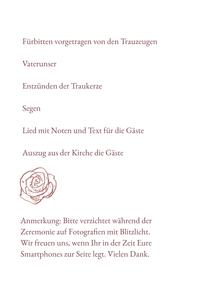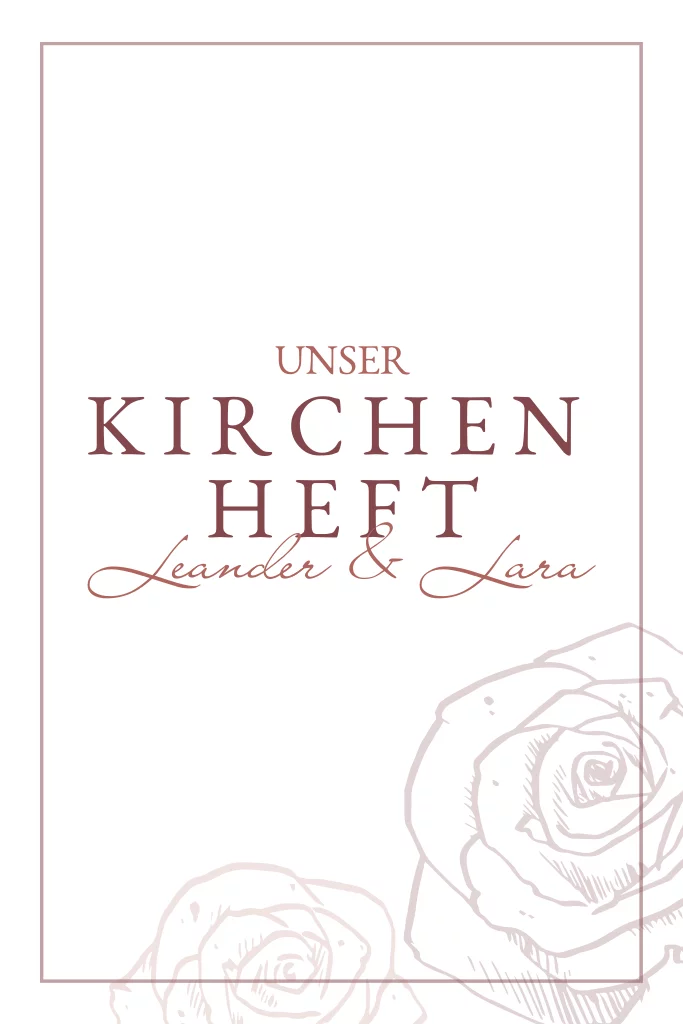 Klassisches weißes Kirchenheft mit Rosen und Rahmen in rot. Die Klappkarte bietet genügend Platz für Euer Kirchenprogramm.