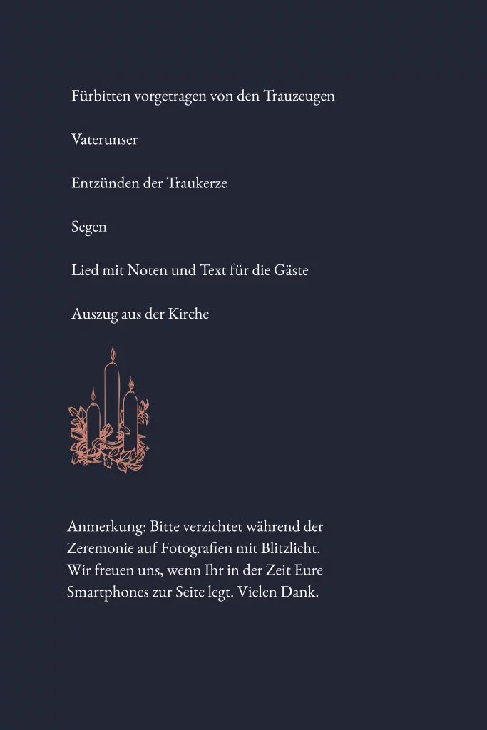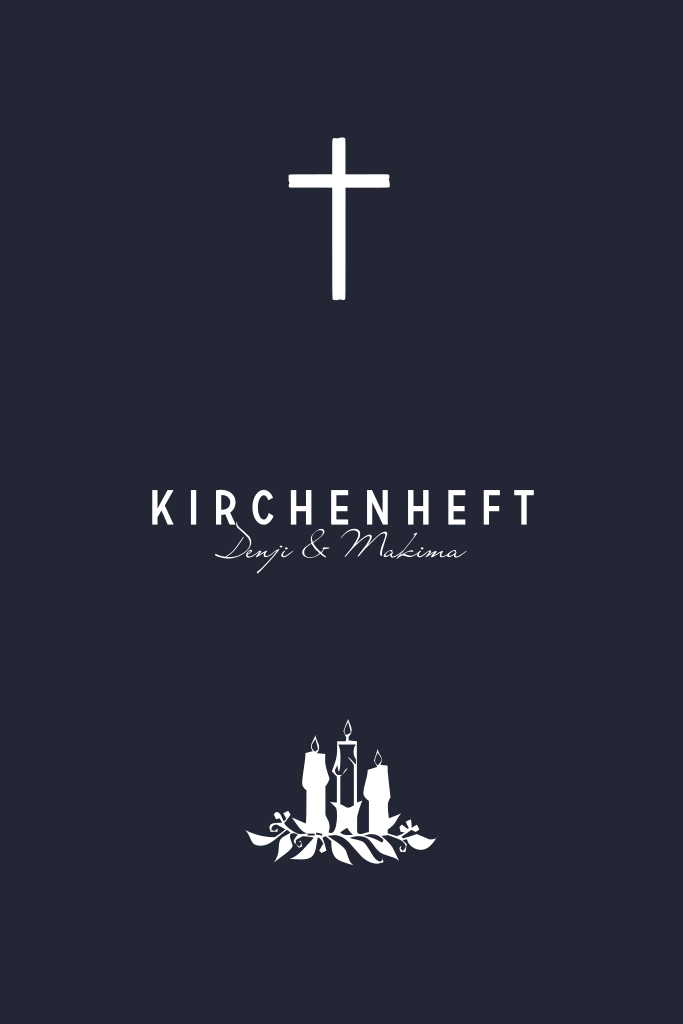 Blaues Kirchenheft zur Hochzeit mit Kreuz und Kerzen. Das schlichte Heft als Klappkarte ist mit Kupferfolie veredelt.