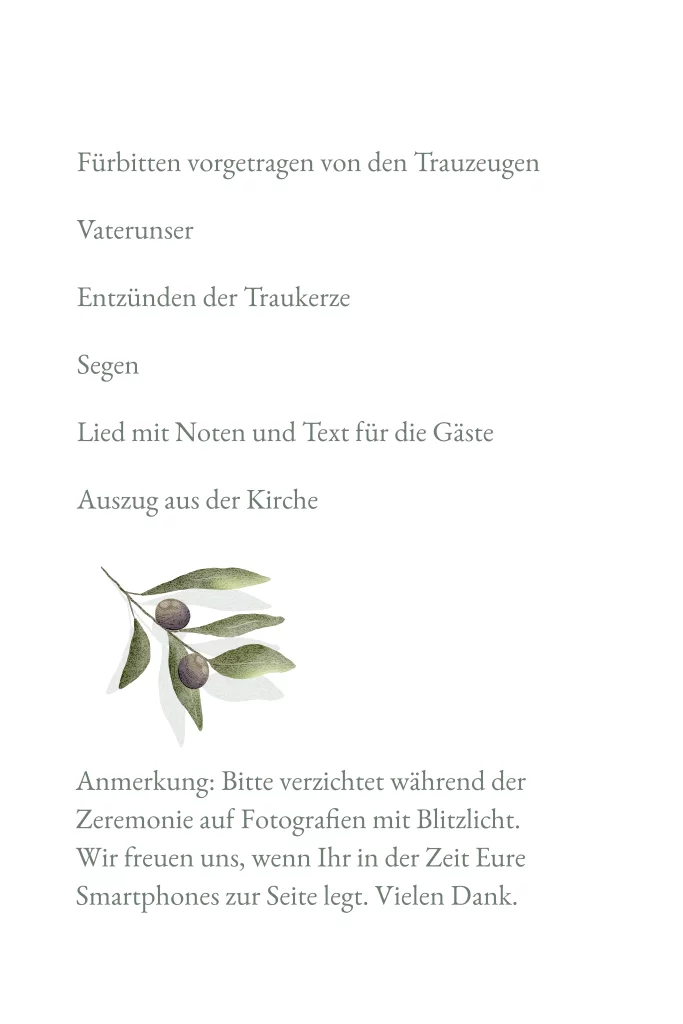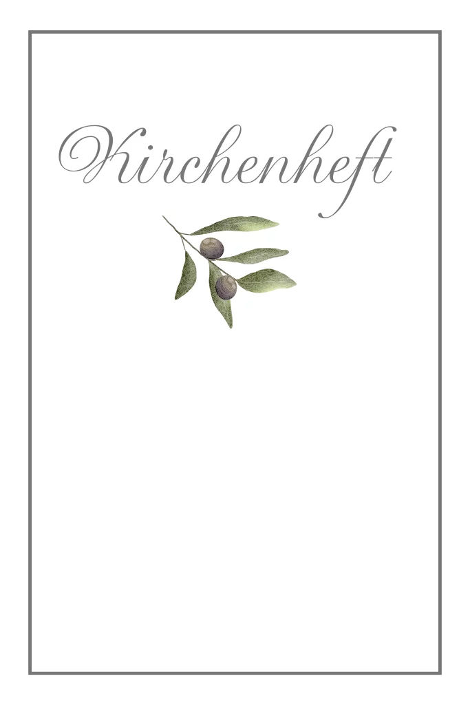 Weißes Kirchenheft als Klappkarte für die kirchliche Trauung. Das Heft wird von einem Rahmen und Olivenzweig geziert.