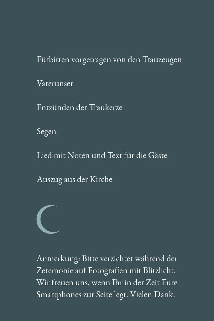 Kirchenheft als Klappkarte für die kirchliche Trauung. Die modernen grafischen Elemente, wie Berge und Monde sind in Gold foliiert. Die Karte in dunklem Grün bietet ausreichend Platz für Euer Hochzeitsprogramm.